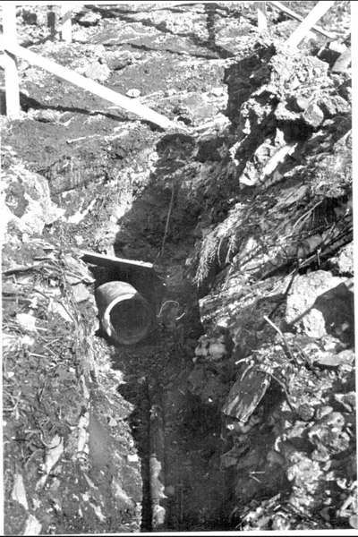 Oppgravd kloakk og kabelgrøft ved Akerselva og Øvre Vøien foss vinterstid. Østre elvebredd. Opparbeidelse for parkanlegg og omlegging av avløp (slutt på å bruke elva som kloakk).