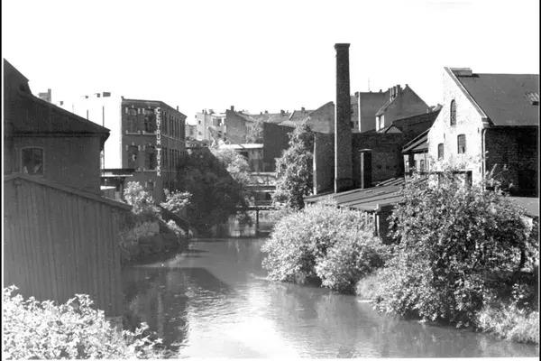 Akerselvas sydgående løp fra Grünerbrua.Trehuset til venstre (Østre bredd) er Stolmaker Engebretsens hus i Nedre gate 3. Industribygget merket med Centrum Trykk er Nedre gate 5 med bru over til Brenneriveien 9 (begge oppr. A/S Indigo) og de gamle industribygningene langs vestre bredd.