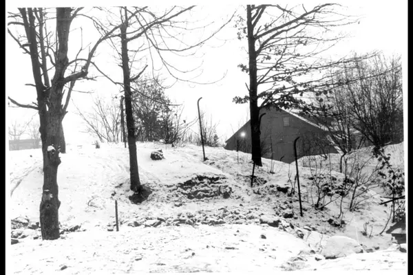 Fra Marcus Thranes gate (før Vøienbruas oppførelse) sydover langs Akerselvas østre bredd mot Beierbrua vinterstid. Inngjerdet og uopparbeidet parkområde.Til høyre ses Glads mølle (Nedre papirmølle).