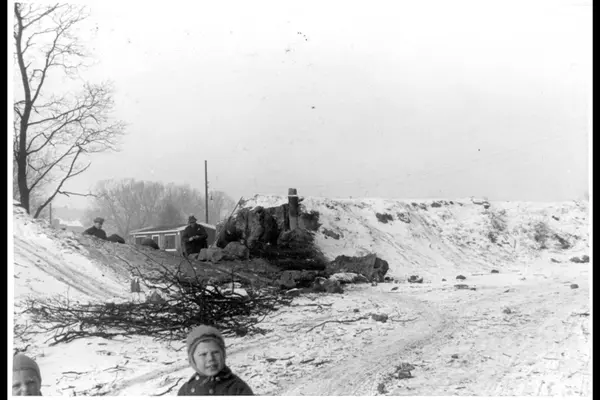 Bryting av stein, gjennomskjæring og Planering av kupert område for parkanlegg ved Akerselvas østre bredd. Nord eller ved dagens Vøien bru. Arbeidsbrakke og arbeidere. To små barn. Vinterstid.