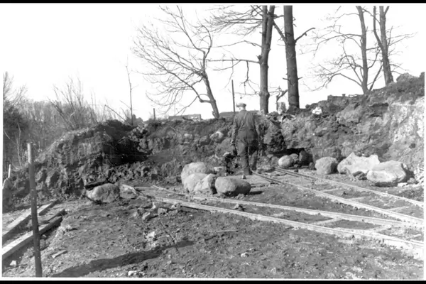 Arbeider i gang med bryting av stein og gjennomskjæring av fjellknaus for turvei og planering av parkbelte langs Akerselvas østre bredd nordover mot Marcus Thranes gate (Vøienbrua ikke oppført). Skinner for transport av fyllmasse med vogner.