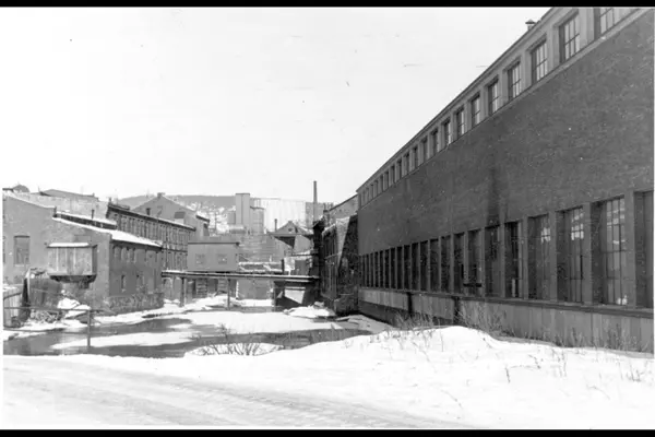 Myrens mekaniske verksteds lokaler på begge sider av Akerselva en vinterdag. Gangvei (kjørevei) over bru til Myraløkka. Bildet tatt nordover med kornsilon til Bjølsen valsemølle i bakgrunnen.