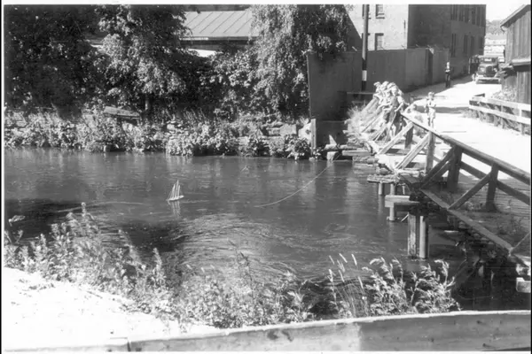 Sommer ved Akerselva. Guttegjeng hengenes over rekkverket på en trebru over elva, lekende med en seilbåt i band. Muligens den gamle trebrua som var forbindelsen over elva før Vøienbrua var oppført. Bildet tatt fra østre bredd mot vest.