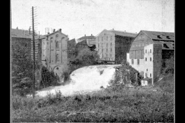 Elva nord for Beierbrua ved Vøyenfallene. Øvre fossefall med Hjula Veveri (Væveri). Gangbru fra tekstilfabrikken til Glads mølle til høyre. Uopparbeidet grøntområde ved elva nedenfor Sandakerveien. Stolpe med mange strømkabler.