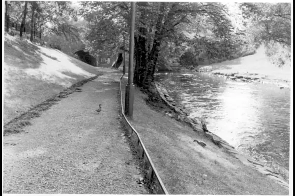 Opparbeidet Parkanlegg, belysning og turvei langs Akerselvas østre bredd sydover mot Ankerbrua mellom Torvbakkgata og Søndre gate. Akerselva med brua i bakgrunnen. Øvre venstre hjørne plankegjerde mot gamle bebyggelsen kalt Ny York. Se bilde A-20145/Uaa/0002/004.
