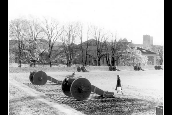 Kanoner på lavett oppstilt på Prins Carls bastion. Bildet tatt østover mot Festningsplassen, og fra høyre festningens gymnastikksal (1861), Hovedarsenalet (1859) og Arsenalforvalterboligen (1860). Trerekke på plassen langs Kongens gate. Bak gymsalen ses siloene på utstikker 3 (Vippetangen). Den venstre ble revet i sutten av 1970-årene. Bildet tatt i oktober
