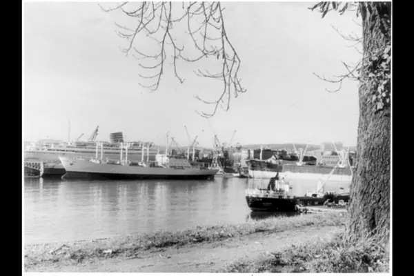 Akers mekaniske verksted og Tingvallakaia sett fra Stallgårdens batteri på Akershus fetsning. Pipervika. Laste- og frakteskip og kraner langs brygga. Passasjerskip (crusie) fra Den Norske Amerikalinje i dokk. Stykkgodsskip fortøyd ved Akershusstranda. Bildet tatt i oktober.