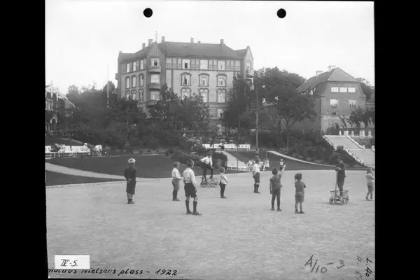Barn i lek (trekjærrer) på den gruslagte plassen. Barn og mødre med barnevogn, sittende på hvitmalte benker i en ny opparbeidet parkanlegg (1919-1921) som omkranser plassen. Trappen opp til Professor Dahls gate til høyre i bildet med Langårdsløkken i bakgrunnen. Professor Dahls gate 35 midt i bildet.Trevillaen (Sveitservilla 1878) til venstre er Professor Dahls gate 37 der Fearnleys gate munner ut. Vestkanttorget.