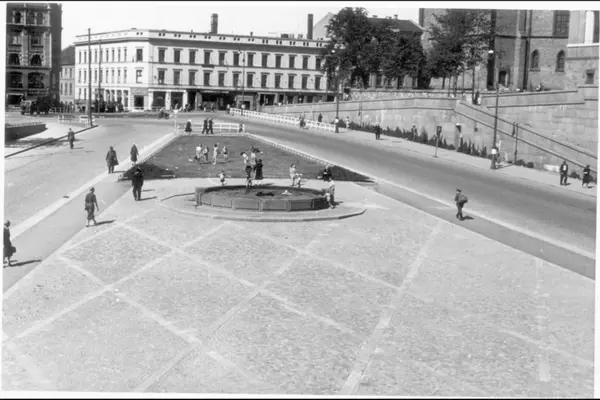 Arne Garborgs plass brosteinbelagt med grøntanlegg og fontenen hvor barna kunne plaske om sommeren (forsvant på 1970-tallet). Hospitalsgata (til venstre) og Henrik Ibsens gate (nå Hammersborggata). Bakgrunnen Akersgata med Teatergatas utløp, Malthebygården. Til høyre Trefoldighetskirken (1858) og Deichmanske bibliotek.