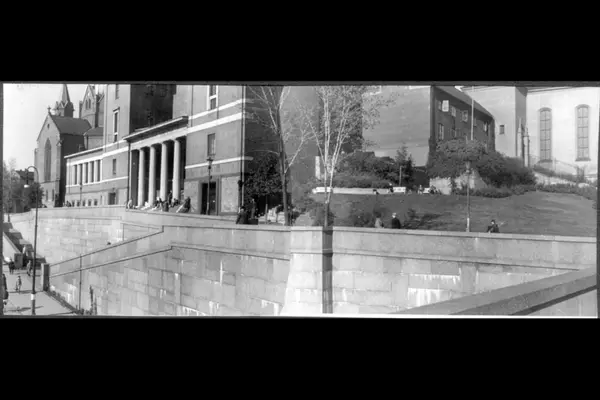 Deichmanske bibliotek, kommunens folkebibliotek (oppført 1933). Granittsøylene markerer hovedinngangen. Murfasaden ned til Henrik Ibsens gate (nå Hammersborggata) og Arne Garborgs plass. Til venstre Trefoldighetskirken (1858). Til høyre Margaretakyrkan (1925). Sammensatt bilde.
