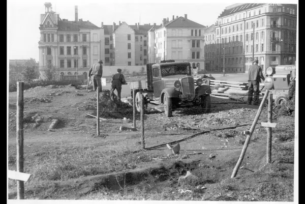 Arbeidere ved lastebil (A-47836) i gang med planering og beskjæring av Abelhaugen. Stokker for oppmåling av gangvei over haugen og samtidig opparbeidelse av alléen fra Henrik Ibsens gate (Drammensveien) retning nordøst over Slottsparken. Kompressor (Clim) for trykkluftbor. I bakgrunnen Victoria terrasse med gammelt gårdsrom og Kronprinsens gate med Glitnegården til høyre. Bygningen som lå her i front, på siden av Victoria terrasse ble feilbombet nyttårsaften 1944.