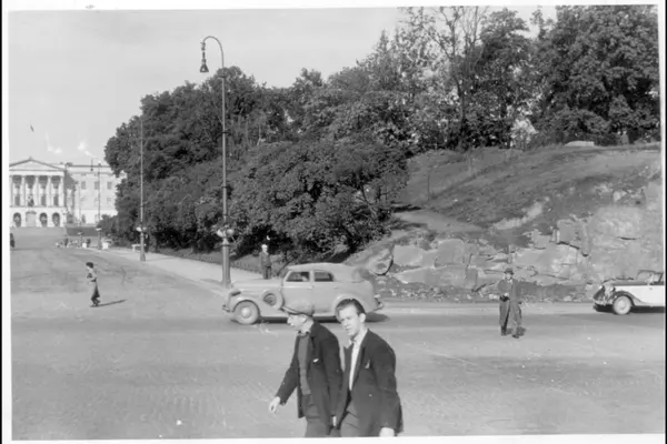 Krysset Frederiks gate og Slottsbakken mot Det kongelige slott. Lyktestolper (Kandelaber GM 18 montert i 1920 årene) dekorert med blomster. Nisseberget med trær og grønne plener. Mennesker (til jobb) og biler i gata. Slottsparken.