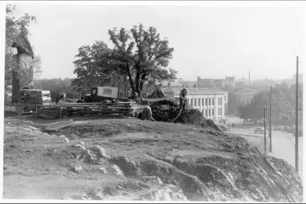 Arbeider med trykkluftbor i gang med beskæring av Abelhaugen. Kompressor ståendes foran Abelmonumentet. Arbeidere med lastebil. Avsagd tre. Østover haugen mot Universitetet med Hotel Bristrol (åpnet i 1920) i bakgrunnen. Slottsparken.