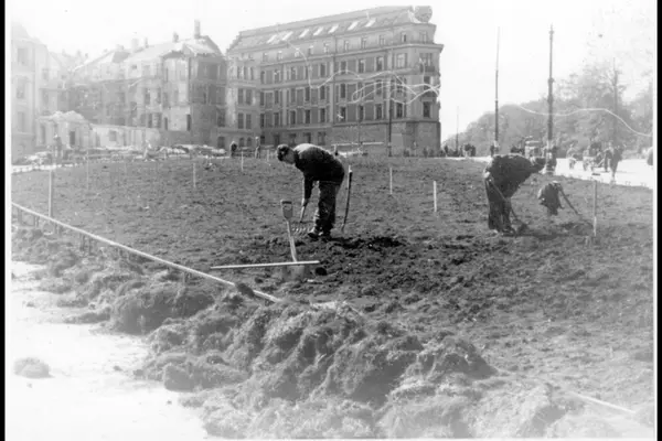 Arbeidere i gang med å utplanere jord på 7. juni plassen (oppkalt 1962), ut mot Henrik Ibsens gate (Drammensveien), til et langsmalt grøntanlegg. Plassen kjent som Triangelen. I bakgrunnen ruinene av Drammensveien 2 etter bombingen. Til høyre Glitnegården. Hjørne-forettningen til lukket p.g.a skader.
