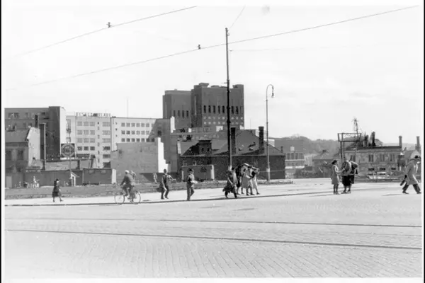 Drammensveien (nåværende Henrik Ibsens gate ) med syklende og spaserende ved Triangelplassen (7. juni plass fra 1962). Kvartalene mellom Ruseløkkveien (med gammel bebyggelse og Thunes mek. Værksted) og Klingenberggata. Til venstre for Rådhuset forretningsgården (fra 1934) langs dagens Olav Vs gate med bl. a. Saga Kino. Mellom gårdene i høyre hjørne går Bakkegaten og man skimter takene på Vestbanestasjonen.