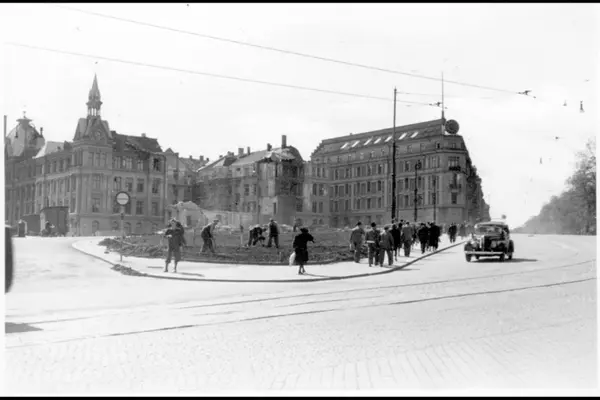 Triangelplassen, omdøpt 1962 til 7. juni plass, beliggende mellom Victoria terrasse, Kronprinsens gate og Drammensveien (nåværende Henrik Ibsens gate). Arbeidere i gang med å utforme et langsmalt grøntområde mot Drammensveien. Ruinene av Drammensveien 2 (feilbombet av allierte nyttårsaften 1944, målet var Victoria terrasse) i bakgrunnen. Arbeidsbrakker, mennesker og bil.