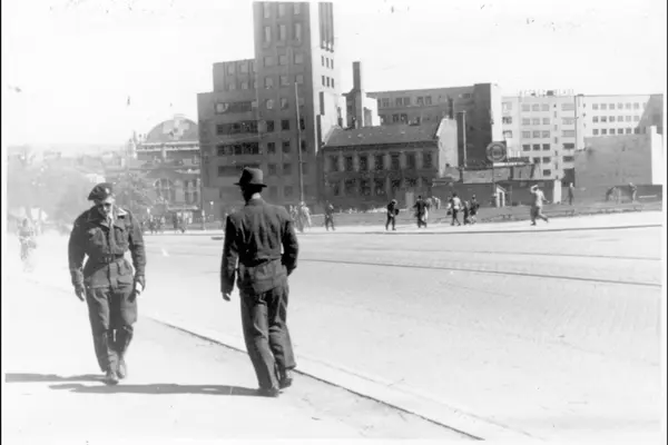 Norsk soldat (offiser) i battledress-uniform og Beret gående vestover Drammensveien (nåværende Henrik Ibsens gate) mot mann i dress. I bakgrunnen Triangelplassen, den senere 7. juni plass (fra 1962) og kvartalene mellom Ruseløkkveien (med gammel bebyggelse) og Klingenberggata. Torstedgården (fra 1935, på hjørnet) i Stortingsgata 30. Nationaltheatret ned til venstre.