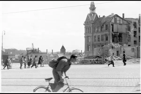 Syklist med ryggsekk opp langs nåværende Henrik Ibsens gate (Drammensveien). Bak ses tårnet på Pipervikens småkirke i Munkedamsveien 12. Ruinene etter den mislykkede engelske bombingen rettet mot Victoria terrasse, traff Drammensveien 2 (til høyre) og trikk på Drammensveien. Victoria terrasse bak. Mennesker ved Triangelen (7. juni plass).