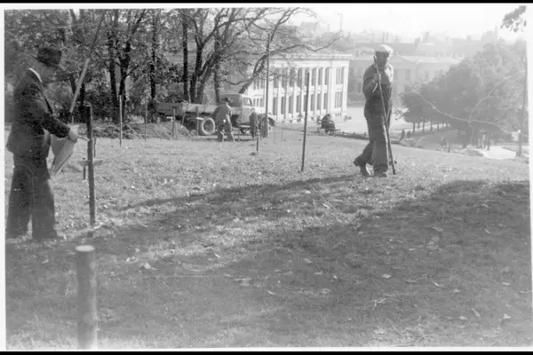 Parkarbeidere med lastebil i ferd med å stake ut turveien over Abelhaugen i fra Slottsbakken ved krysset Frederiks gate/Karl Johans gate. Mann trolig i fra Tekniskrådmann/oppmålingskontoret med plankart over området.Universitetet i bakgrunnen. Østover.