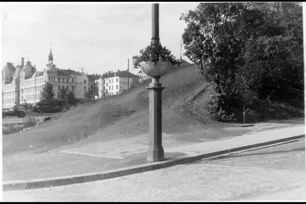 Blomsterdekorasjon på lyktestolpe ved Slottsbakken (Karl Johans gate). Opparbeidet gangvei, uten dagens trappeløp, opp mot Abelhaugen. Henrik Ibsens gate (Drammensveien), Beplantet 7. juni plass (dengang kalt Triangelen) og Victoria terrasse i bakgrunnen. Bildet tatt 1949 - 50.