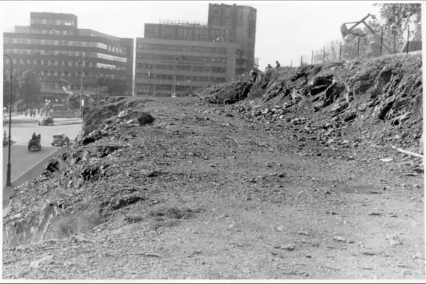 Anleggelsen av turveien og platået i fra Wergelandsveien, langs Frederiks gate mot Slottsbakken på Nissebergets Østlige side. Inngjerdet med gravemarskin mot Slottsparken. Hest og vogn, biler i krysset Karl Johans gate ved Nationaltheateret / Nasjonalteateret stasjon. Odd Fellow og Torstedbygningene i bakgrunnen. Bildet tatt 1949 - 50.