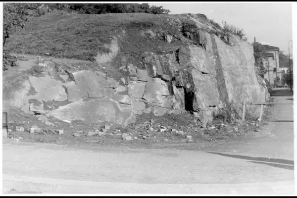 Nisseberget, en høyde i Slottsparken (opprinnelig en del av Marielyst løkke). Bildet tatt i fra Slottsbakken med Frederiks gate mot Wergelandsveien i høyre hjørne. I bakgrunnen ses Universitetets gamle Kjemibygning, oppført 1875. Bildet tatt 1949 - 50.