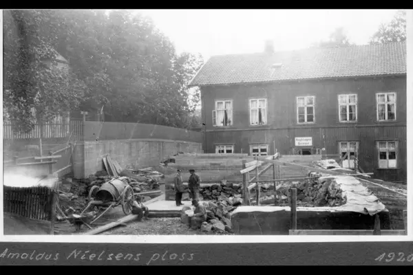 Arbeidere i gang med bygging av den fem meter brede trappen opp til Professor Dahls gate i den østlige enden av plassen ( Professor Dahls plass, Vestkanttorget). I bakgrunnen Langårdsløkken. Trebygningen (fra 1859, skole) merket Hægdehaugens asyl (Grunnlagt som Hegdehaugens Asyl 1872) i Professor Dahls gate 36 huser Hegdehaugen daghjem siden 1886.