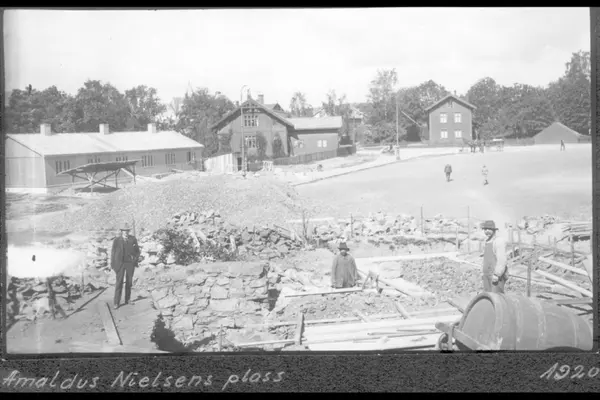Fra omtrent fyllplass til opparbeidelse fra 1916 til bruk for torghandel. Professor Dahls Plads, Professor Dahls plass frem til 1934. Grusplassen planert og arbeidere i gang med byggingen av trappen i den østlige delen. Trehuset til høyre er Blida eller Nordre Blida (Tidemandstuen) i Tidemands gate 44. Trehuset til venstre er trolig Søndre Blida (Tidemands gate 43). Revet 1935. Uoffisielle betegnelsen Vestkanttorget.