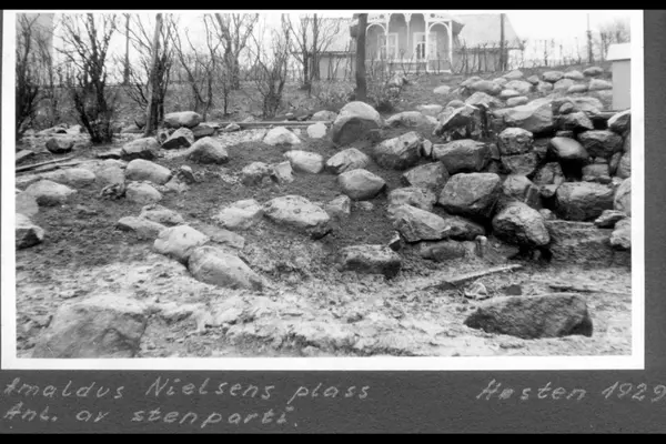 Anlegging av steinhagen som ligger øst i parken. Rørsøyle for tilkobling til Fontenegruppen med "Gutten på delfinen" av Sigri Welhaven (avduket i 1929). I bakgrunnen ses sveitervillaen i Professor Dahls gate 37. Plassen het tidligere Professor Dahls Plads frem til 1934. Uoffisielle betegnelsen Vestkanttorget. Bildet tatt på høsten.