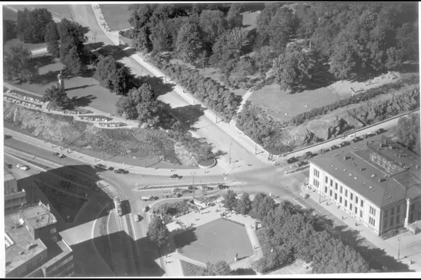 Flyfoto over Studenterlunden med Stasjonsnedgangen til Nationaltheateret / Nasjonalteateret stasjon. Henrik Ibsens gate (Drammensveien) mot Stortingsgata - Frederiks gate. Karl Johans gate med Universitetet (Domus Bibliotheca). Slottsbakken og Slottsparken. Abelhaugen til venstre. Mennesker sittende på benker med Abelmonumentet i midten. Til høyre Nisseberget med opparbeidet lekeplass. Sandkasse og bord/sittebenker. W-36820.