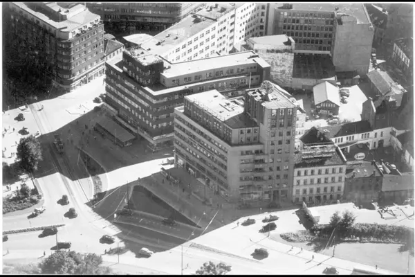 Flyfoto over kvartalene mellom Ruseløkkveien og Klingenberggata. Krysset Stortingsgata - Frederiks gate - Drammensveien (nåværende Henrik Ibsens gate) i forkant. Hjørnegårdene Odd Fellow-bygningen (1934) og Torstedgården (1930 ) i midten med Ruseløkkveien 6B (dengang) og de opprinnelige bygningene fra Thunes mek. Værksted i Ruseløkkveien 8-10 nærmest, i dag forretningsgården og hjørnegården Kommunenes hus (KS). Helt til høyre Bakkegaten i vestre Vika. W-36823.