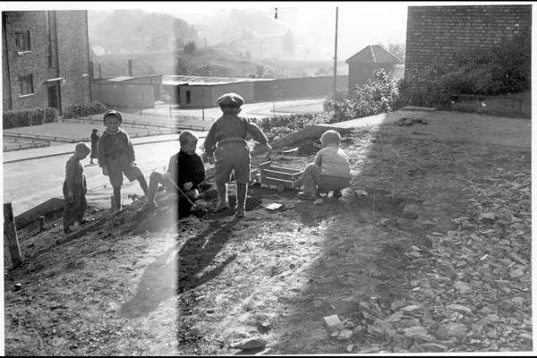Barn i lek ved trappeløpet ned fra Trysilgata til Telemarksvingen. Bildet tatt østover i fra plassen hvor Christiania Staalværk, senere Sportshallen holdt til. I dag Normannsgata friområde. Hjørne-tretårnet i bildet er baksiden på Kampens friluftsbad. Trebebyggelse, eiet av Oslo Kommune, muligens lagerlokale for badet. Bakerst ses Gjøvikbanen.