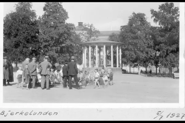 Birkelunden park med den nye musikkpaviljongen. Lekeplass. Barn leker i vannbasseng, voksne titter på. Hatteprydete menn,og er det parkutvalget som er på befaring?