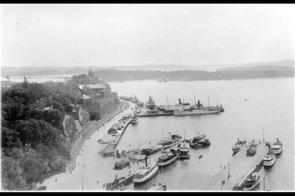 Fra Pipervika. Brygge 1 og 2 (A og B). Akershusutstikker. Nordre og søndre Akershuskai. Skutemiljø. Akershusstranda. Havnebanen. Akershus festning, vestre del. Hovedøya nærmest i bakgrunnen.