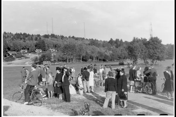 Tilskuere fra innvielsen eller noen som venter på kamp? Sanitetsforeningens hytter - Julemerkehyttene - for tuberkuløse og Brannfjellområdet med radiomaster i bakgrunnen.