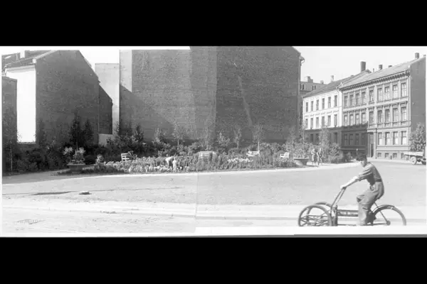 Lite parkområde med plen, benker, blomsterbed og busker på hjørnet Parkveien - Pilestredet. Parkveien 7og 9 i bakgrunnen. Mann på trehjulet sykkel (sykkelbud?) med reklame for BERG BILFORRETNING.
