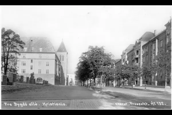 Bygdøy allé opp mot Frogner kirke, sett fra Frederik Stangs gate. Kastanjetrær. Del av inngjerdet forhage til herskapsvilla i Frederik Stangs gate 22-24. Postkort 132.