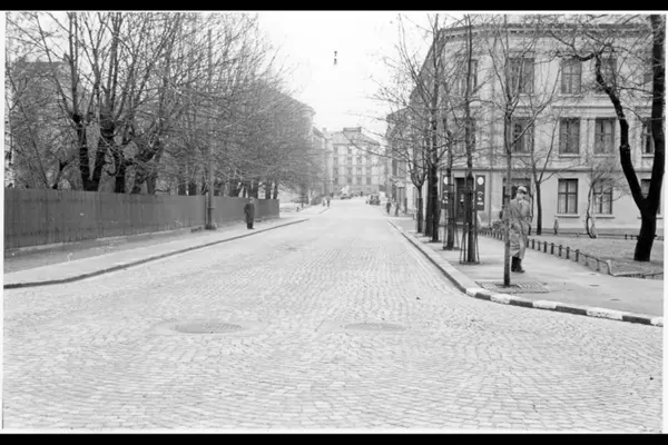 Gata sett nedover fra Parkveien mot Hansteens gate og Ruseløkkveien. Nedre del av Ankerhagen bak plankegjerde, nåværende Bervens Løkke til høyre. Butikk på hjørnet.