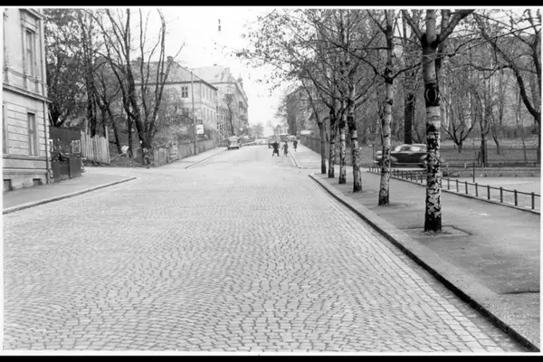 Parkveien (73) sett fra Reichweins gate forbi Observatoriegata opp mot KNA på høyre side og tomten til senere Oslo Handelsgym på venstre side. Ankerparken bak til høyre, nåværende Bervens Løkke foran.
