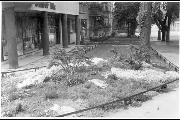 Tidemands gate 43 på hjørnet av Vestkanttorget med granittmuren til Tidemands gate 28 i bakgrunnen til høyre. Forhager med planter, busker og trær. Forretningsbygg? på søyler.