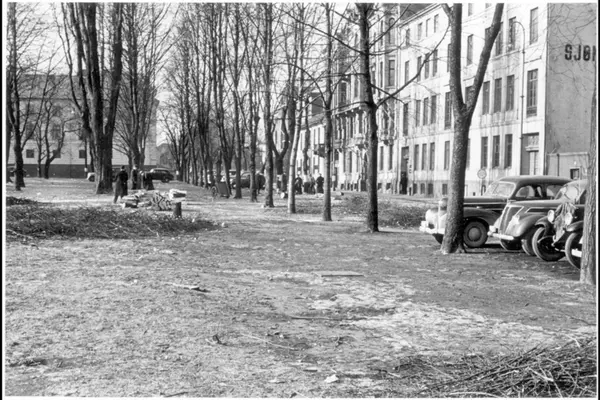 Arbeidere med kvist- og trerydding på plassen. Parkerte biler. Myntgata til høyre, Kirkegata i bakgrunnen. Albumtittel: Gråbeinsletta og anlegg ved Sagene kirke. Grev Wedels plass, Grønland