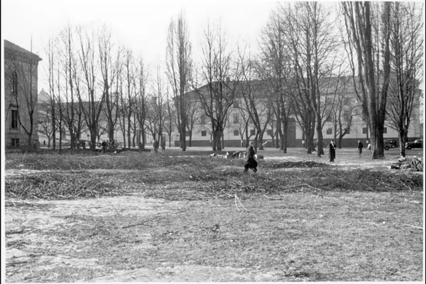 Arbeidere med kvist- og trerydding på plassen. Kirkegata 1-3 i bakgrunnen. Albumtittel: Gråbeinsletta og anlegg ved Sagene kirke. Grev Wedels plass, Grønland