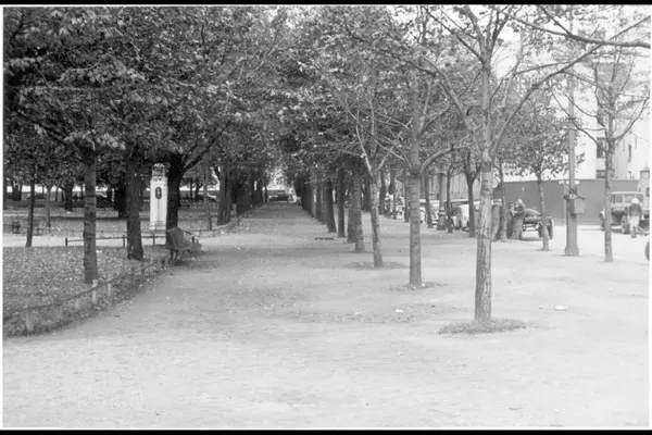 Nordre del av Grev Wedels plass (sett mot vest) med nedstigningstårn, gangveier og alle-trær. Parkering langs Myntgata. Albumtittel: Gråbeinsletta og anlegg ved Sagene kirke, Grev Wedels plass, Grønland