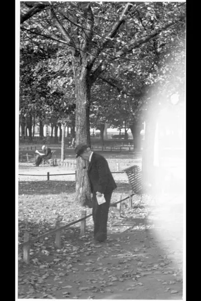 Fra Grev Wedels plass (sett mot vest). Parkbenker. Mann mater fuglene, en annen sitter og leser avisen. (Jfr. bilde A-20145/Uag/0002/020.) Albumtittel: Gråbeinsletta og anlegg ved Sagene kirke, Grev Wedels plass, Grønland