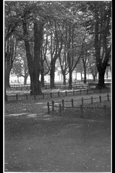 Gangveier og inngjerdede plener på Grev Wedels plass. Den gamle fontene / bassenget i bakgrunnen til høyre. Albumtittel: Gråbeinsletta og anlegg ved Sagene kirke, Grev Wedels plass, Grønland