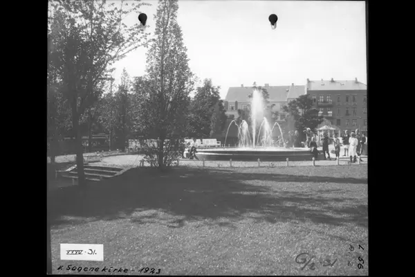 Barn i lek rundt vannfontenen / bassenget i parken ved kirken. Parkbenker. Arendalsgata i bakgrunnen. Albumtittel: Gråbeinsletta og anlegg ved Sagene kirke, Grev Wedels plass, Grønland