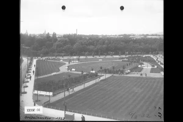 Oversiktsbilde over parken (ferdig i 1922) med gangveier, parkbenker, plener og beplantning. Uelandsgata opp i bakgrunnen. Kierschows gate nede til venstre. Bildet tatt fra kirken mot Nordre Gravlund. Albumtittel: Gråbeinsletta og anlegg ved Sagene kirke, Grev Wedels plass, Grønland
