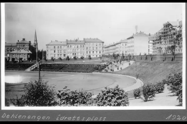 Nordre sving og del av vestre tribuneanlegg på Dælenenga idrettsplass. Klubbhuset. Schleppegrells gate 30 (på hjørnet av Christiesgate) under oppføring. Stillaser på fasade. Grünerløkka skole bak til venstre.