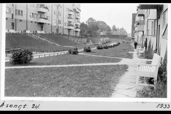 Indre gårdsområde sett mot syd i funkiskvartalet mellom Åsengata, Hans Nielsen Hauges gate og Carl Jeppesens gate. Grus- og helleganger, benker, beplantning i forhager, tørkestativ. Bildetittel er noe villedende, da nr. 24 var adresse på tidligere bebyggelse. (Adressen Åsengata 24 eksisterer ikke i dag). Fra Søndre Åsen-kvartalene.