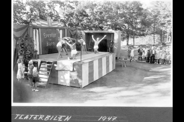 Turntrupp / Gjøglere med teateroppvisning for barn på opphøyet scene ved Frogner stadion i Frognerparken. Kulisse med tekst "Eventyr for Barn". Parkkveld